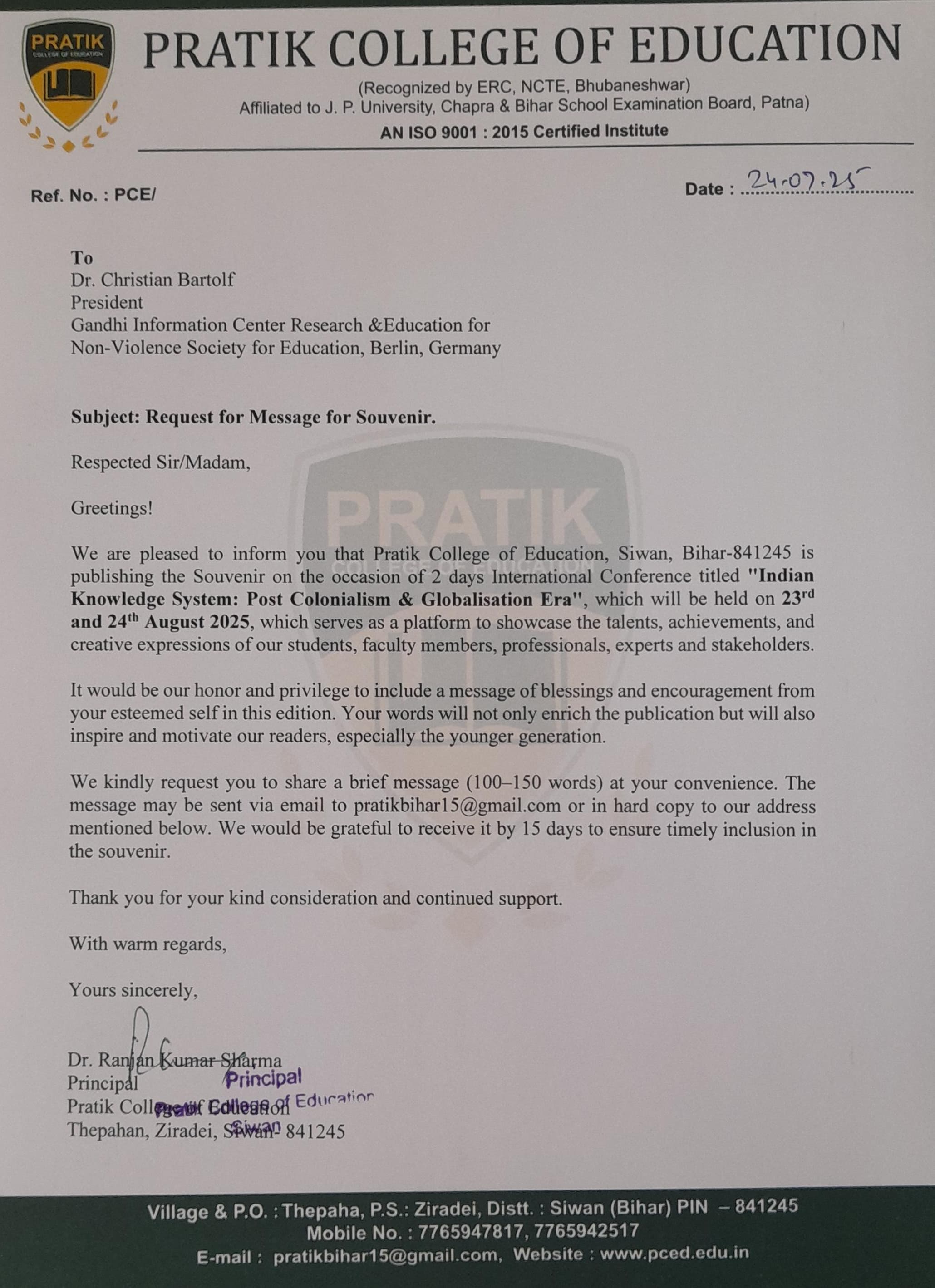 Dr. Mrigendra Kumar, Professor of Mathematics Pedagogy, Department of Education, Ramadhar Singh Teachers Training College (Recognized by National Council for Teachers Education, New Delhi & Affiliated to J. P. University, Chapra, Bihar, India) and Dr. Ranjan Kumar Sharma, Principal, Pratik College of Education (Affiliated to J. P. University, Chapra, and Bihar School Examination Board, Patna, Bihar, India) kindly invited us to participate in the International Conference "Indian Knowledge System: Post Colonialism & Globalisation Era", 23-24 August 2025. Dr. Christian Bartolf gave a lecture on "India's Responsibility for World Peace today".