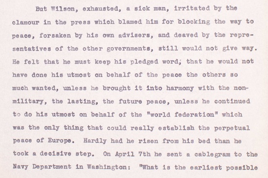 In Stefan Zweig's estate, we find his text on "the non-military, the lasting, the future peace ..." of the world federation "which was the only thing that could really establish the perpetual peace of Europe" ("die einzig Europa errettende 'world federation'"), which may be of great significance for our time. Stefan Zweig wrote "Wilson's Failure" ("Wilson versagt"), the year he and his wife, Charlotte Altmann, went into exile in Brazil. This legacy, in both German and English, was part of his The Tide of Fortune. Twelve Historical Miniatures" (London, 1940).