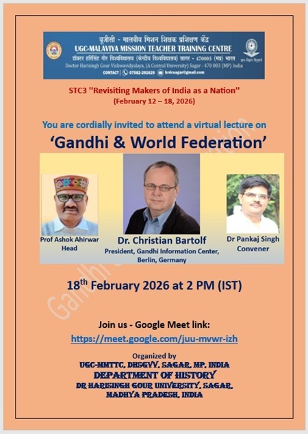 Dr. Suwa Lal Jangu, Assistant Professor, Department of Political Science (Mizoram University, Aizawl, India), kindly invited us to contribute to the International Webinar "150 Years of Mahatma Gandhi" with a lecture on "Mahatma Gandhi and the Nuremberg Principles of International Law" (Christian Bartolf), referring to Mahatma Gandhi's public statements about the atom bomb.